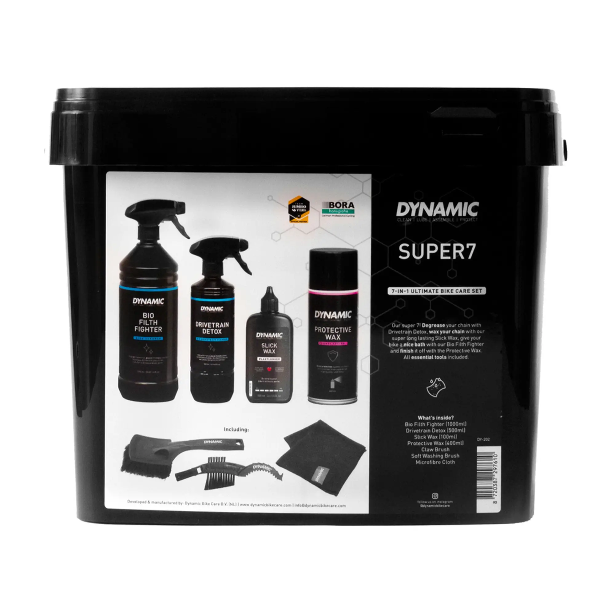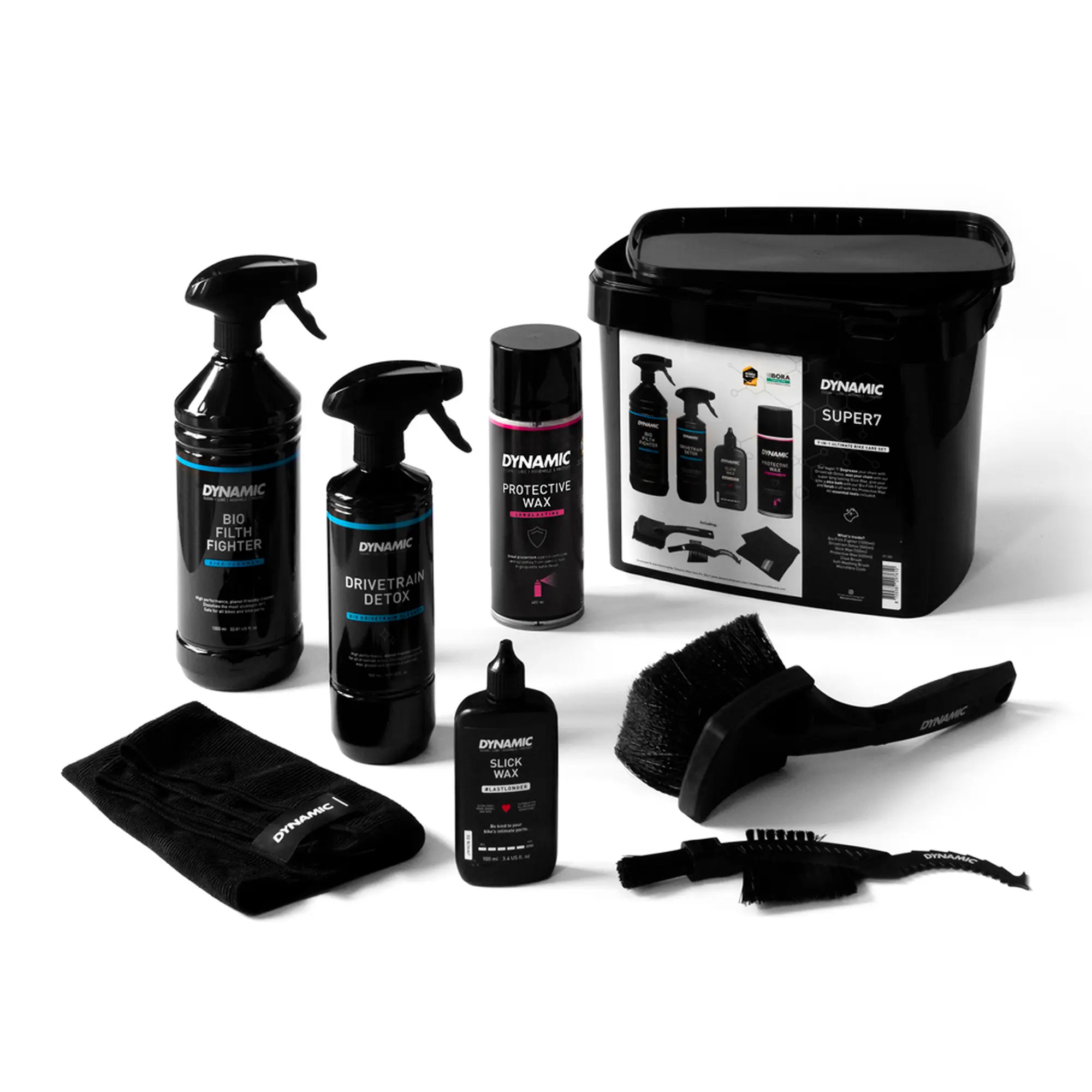 De Dynamic Super 7 is de ultieme fietsonderhoudsset voor racefietsen, gravelbikes, MTB’s en e-bikes. Ontvet de ketting met Drivetrain Detox en wax de ketting met Slick Wax welke lang mee gaat. Was de fiets met Bio Filth Fighter en eindig de schoonmaakbeurt met Protective Wax. Alle benodigde borstels zitten in deze set.