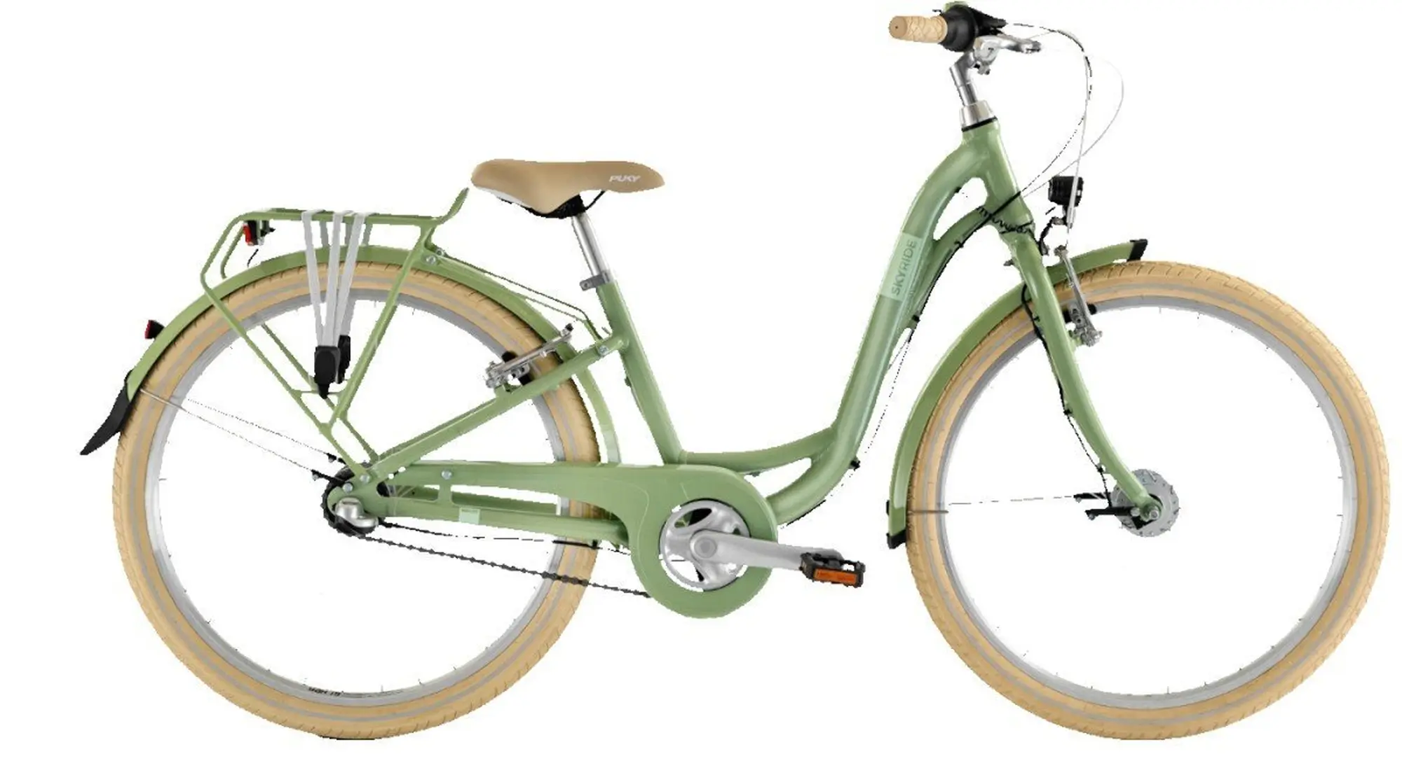 De gesloten kettingkast beschermt tegen vuil en vocht en houdt kleding schoon. De lichte aluminium cranks zorgen voor een comfortabele rit zonder vervelende geluiden. Met de draaigreep en versnellingsindicator kun je eenvoudig en intuïtief schakelen. De schachtsteel van de PUKY SKYRIDE 24-3 is bijzonder duurzaam dankzij de lange verstelfunctie, zodat de fiets met het kind kan meegroeien.