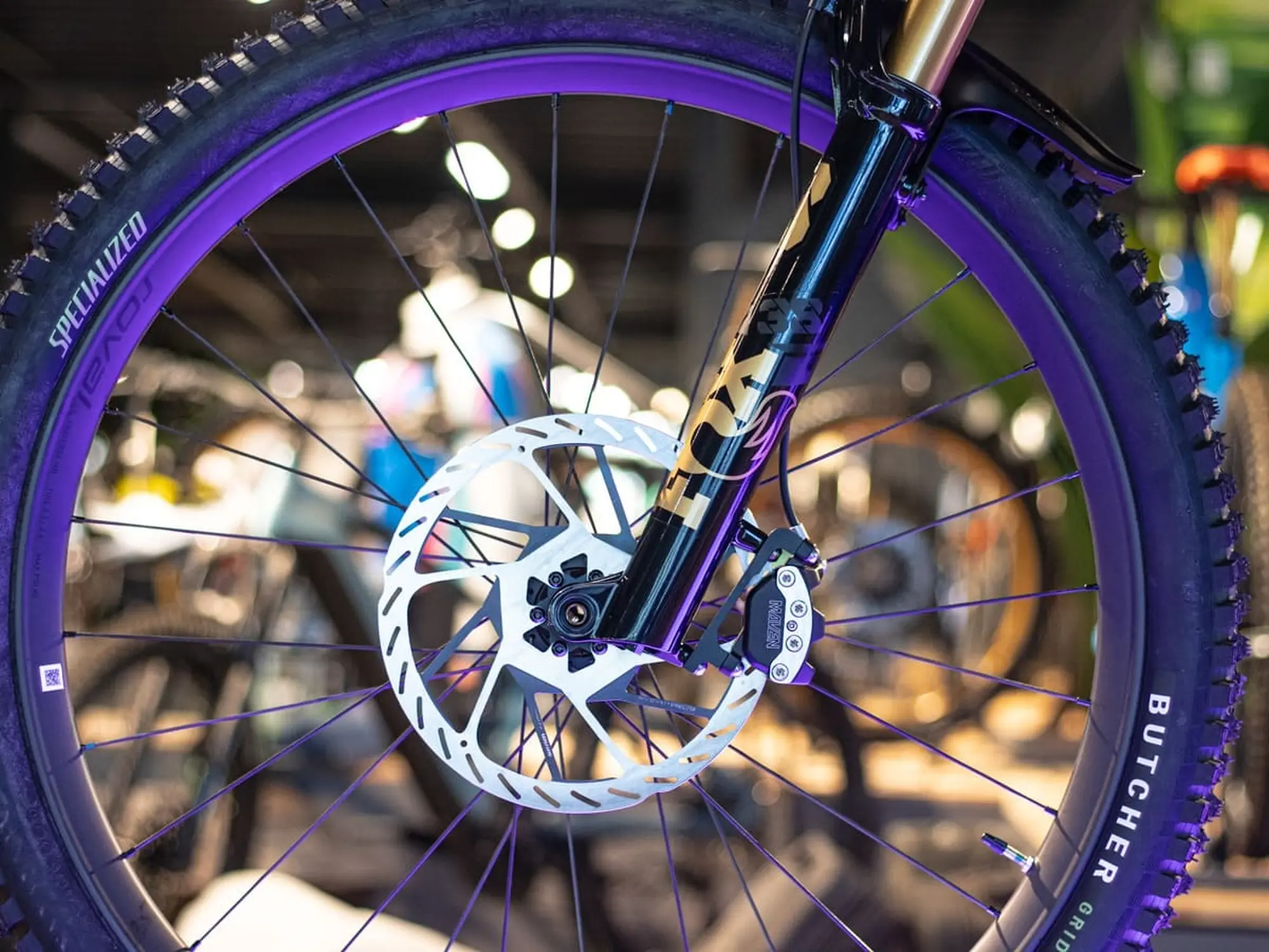 Remmen doe je met overtuiging: SRAM Maven Ultimate 4-pots op 220/200mm rotors—krachtig, direct, en betrouwbaar, zelfs op natte, gladde afdalingen.