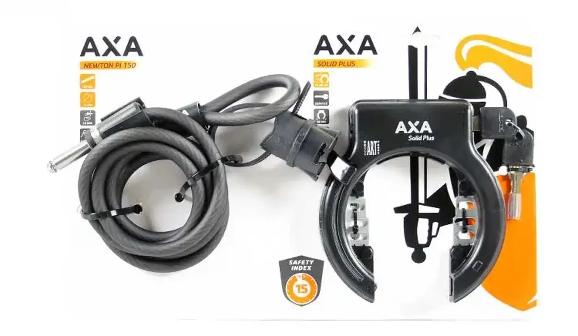 Deze set bestaat uit de AXA Solid Plus en Newton 150 plug-in kabel: een complete set om met één handeling de fiets met sloten te beveiligen.