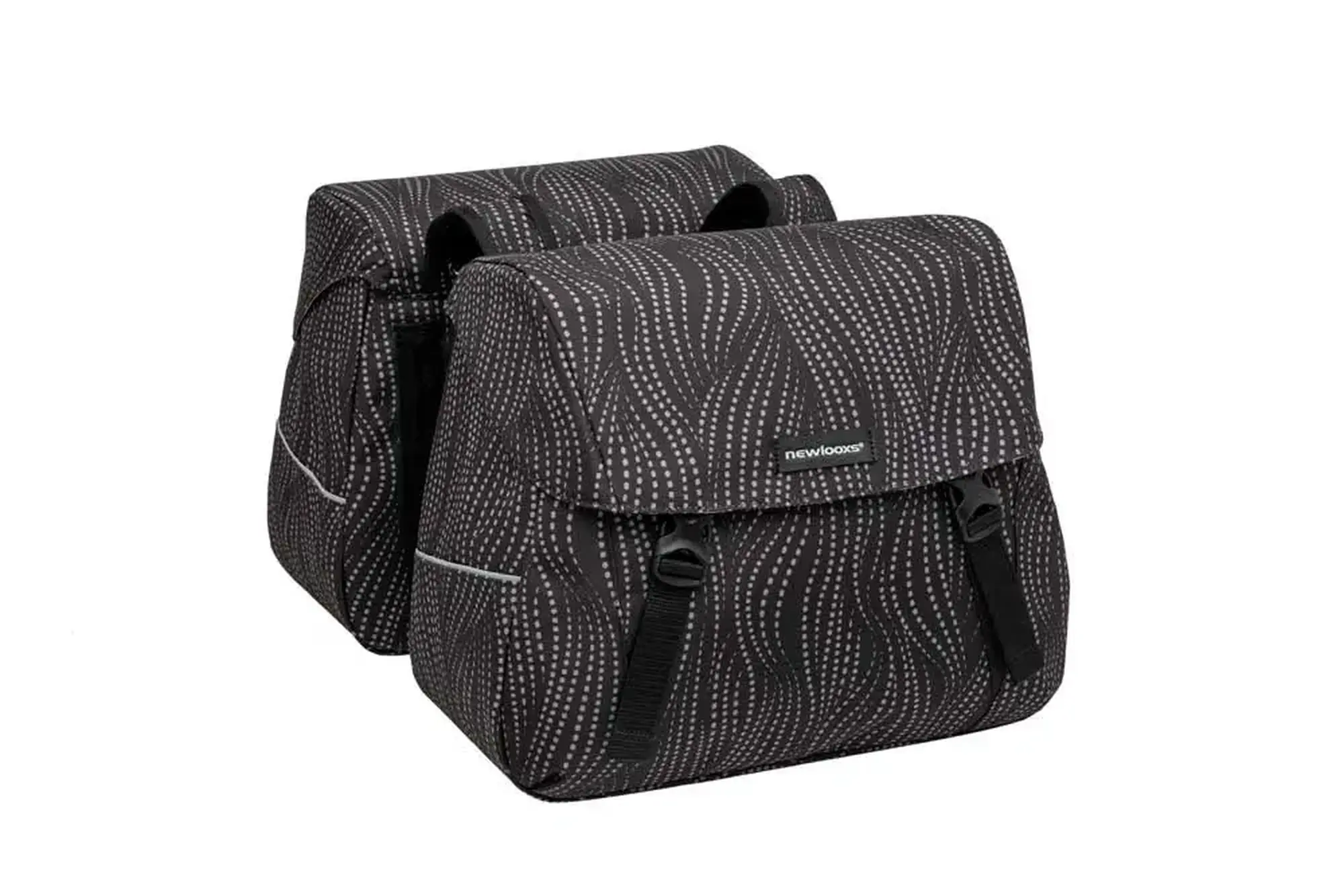 De New Looxs Joli Double is een stevige dubbele fietstas van waterafstotend polyester en praktisch en handig voor boodschappen, werk, school of recreatief fietsen. Gemaakt van 100% gerecycled polyester. De tas bevat een ruim hoofdvak en een extra ritsvak onder de klep. De tas sluit eenvoudig met klikgespen en wordt aan de bagagedrager bevestigd met riempjes. Hij is geschikt voor verschillende fietsen, inclusief elektrische fietsen. Een klittenband riempje biedt extra stabiliteit. De tas kan met kunststof platen in vorm worden gehouden. Reflecterende elementen zorgen voor veiligheid in het donker.