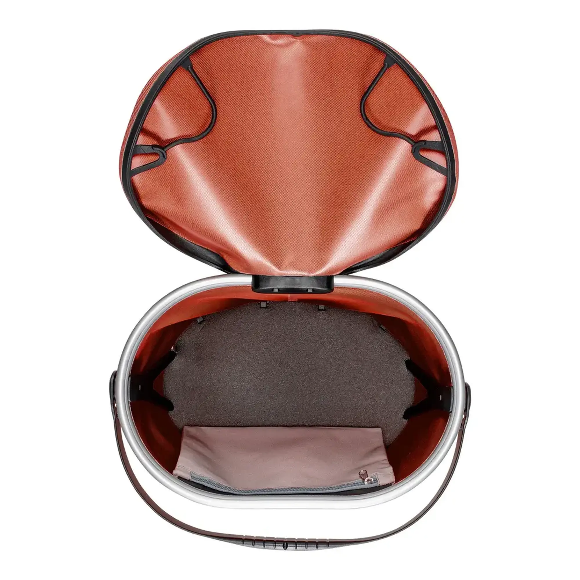 Gemaakt van PU-gecoat nylon, rondom verstevigd en voorzien van een aluminium frame aan de bovenrand. De tas blijft stevig staan dankzij slimme steunvoetjes en behoudt altijd zijn vorm – of hij nu op de fiets zit of naast je op de stoep staat. De klep met rubberen rand sluit met twee elastische lussen en biedt snelle toegang tot de inhoud. Binnenin zit een extra ritsvakje voor je sleutels, telefoon of portemonnee.